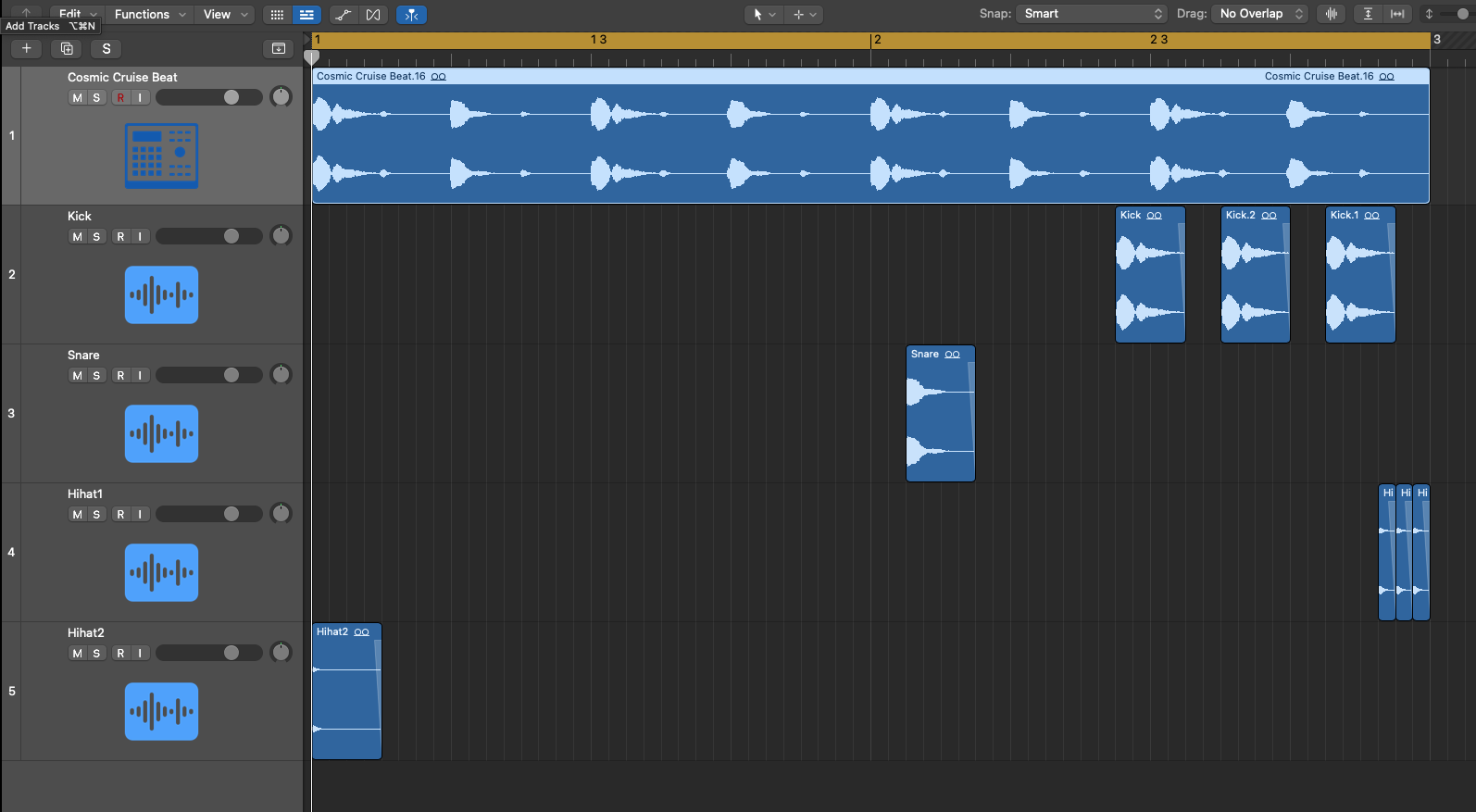 드럼 루프 재배열은 앞에서 배운 오디오 파일 에디터에서 해도 되지만 직접 오디오 리전을 슬라이스해서 재배열하는 방법도 있다.